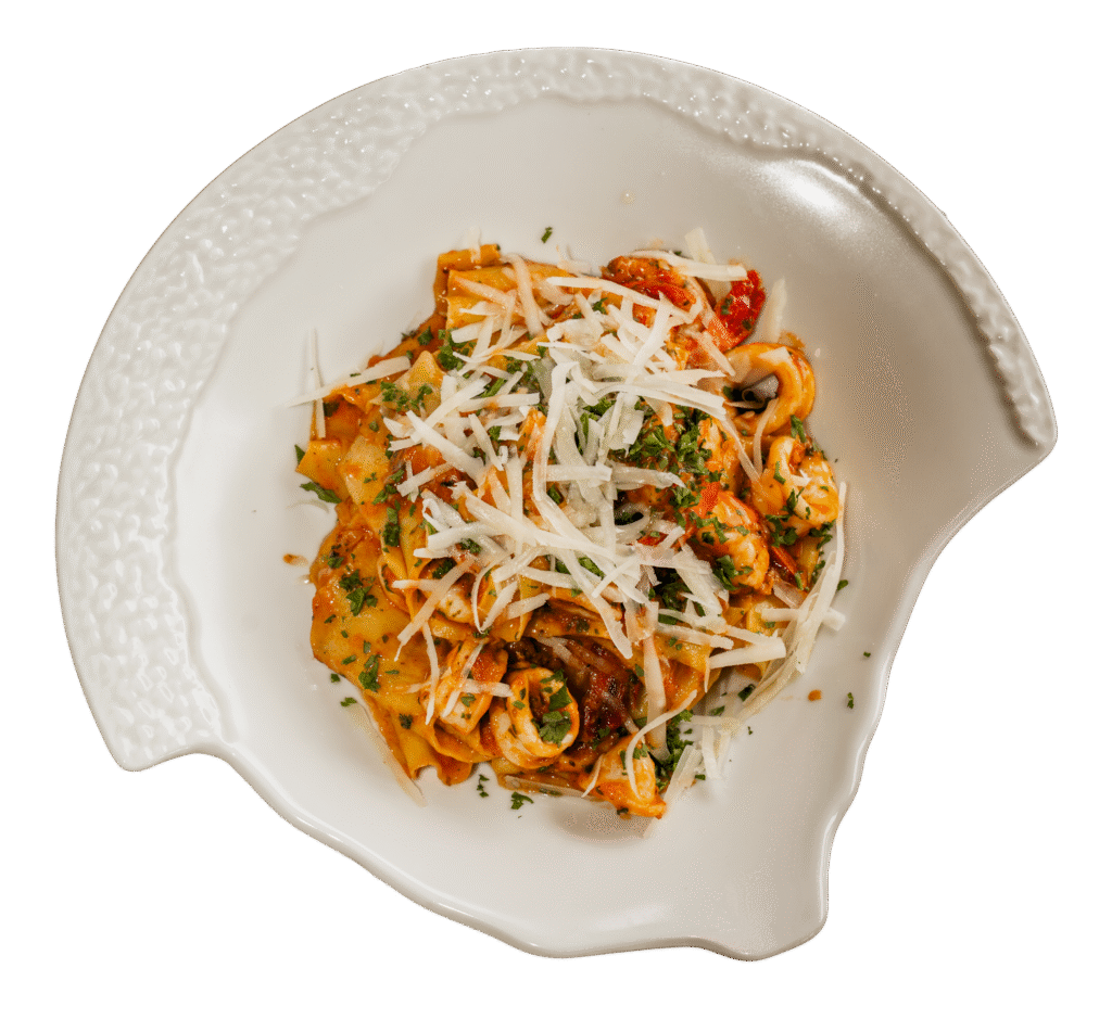 Fresh pappardelle pasta served with juicy prawns and tender calamari in a rich homemade tomato sauce, finished with parmigiano and a touch of olive oil.